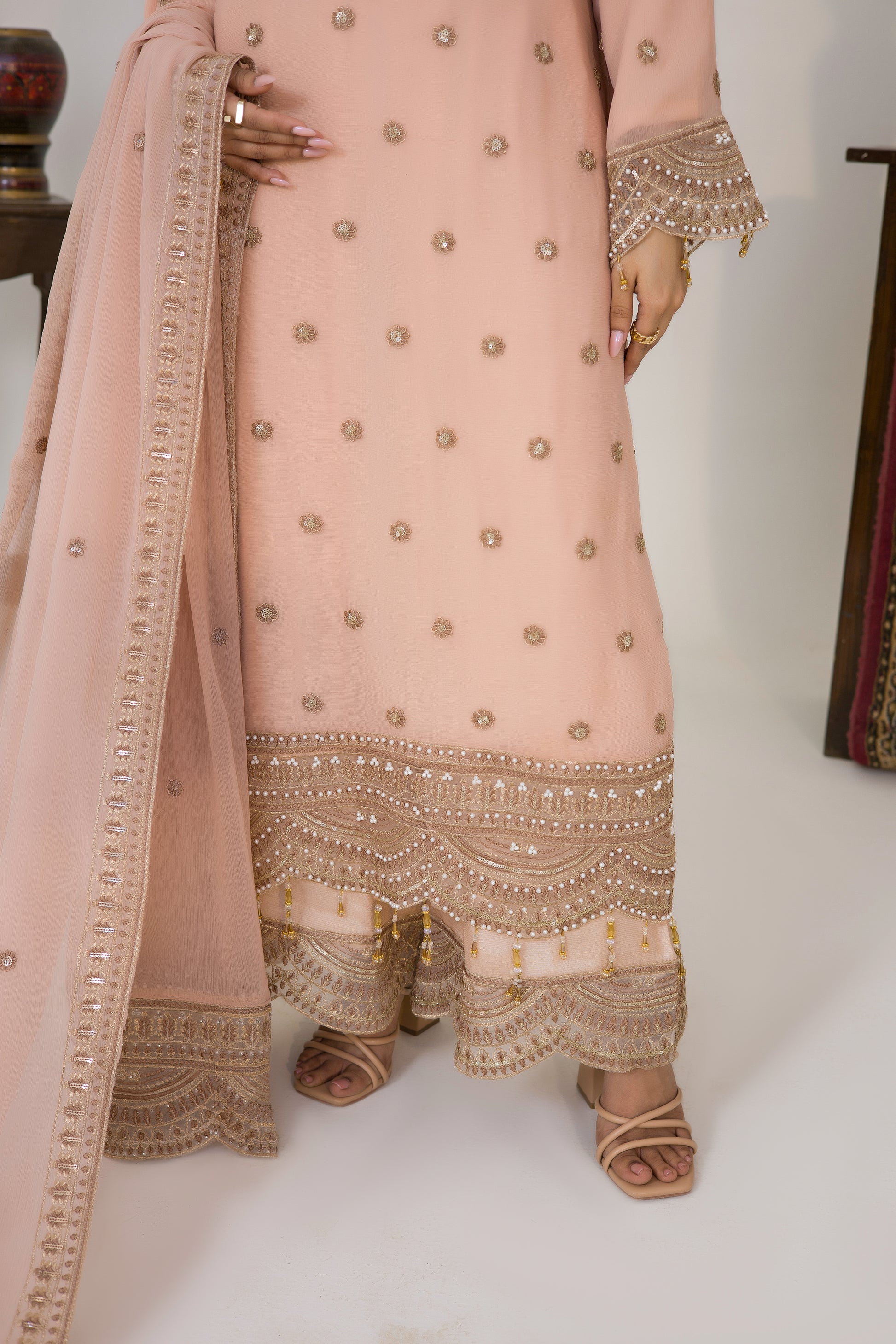 * Ready To Wear Hand Embellished And Sequins Embroidered Two Sided Chiffon Dupatta With Attached Pallus.